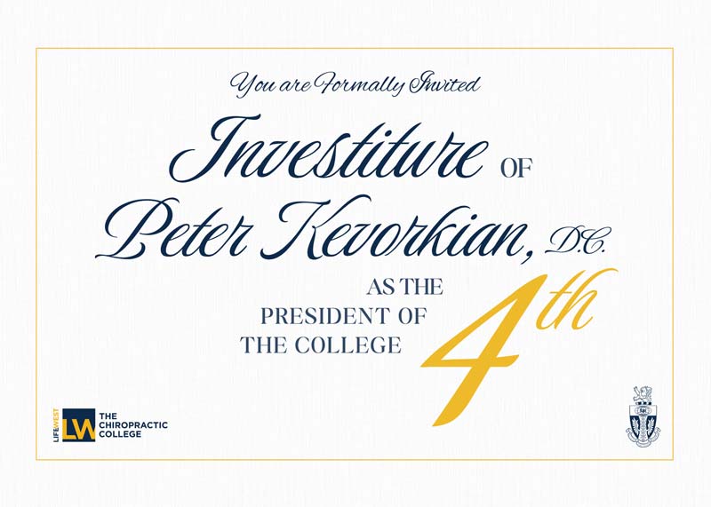 The formal investiture of Dr. Peter Kevorkian as the 4th president of Life Chiropractic College West will take place on Friday, October 10th, 2025 at 4:00 PM.